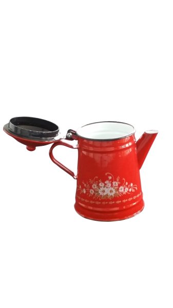 Emaillierte Deko-Kaffekanne in rot mit weißem Blumendekor. Innenfarbe weiss, ca. 1 Liter Inhalt.