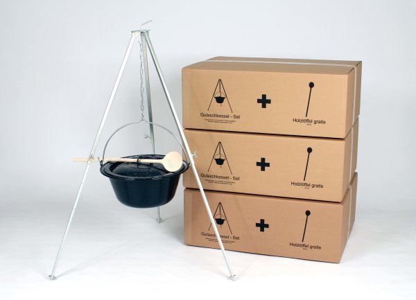 Set besteht aus Kessel+Deckel 10Liter, Teleskopständer 120cm und einem Holzlöffel